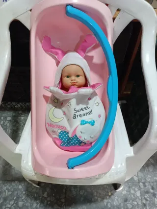 Este set incluye un muñeco con su cunita - El muñeco lleva un gorrito con orejas de conejo. - La cunita tiene un diseño con estrellas, una luna y un conejo. - El móvil de la cunita es de color azul.