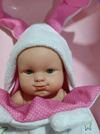 Preciosa muñeca reborn con cuerpo de tela y cabecita y extremidades en vinilo siliconado (totalmente achuchable). Pelito castaño injertado y detalles que le dan realismo. Longitud 45 cm, peso sobre 1 kg 400 gr. Se entrega con un body, pichi de conejitos, pendientes, pañal, chupete con cinta de sujección, biberón y certificado. Envío en caja con papel de regalo