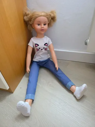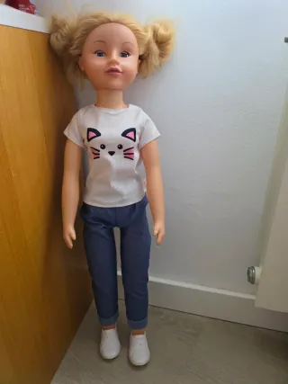 Muñeca grande con pelo rubio recogido en dos moños. Lleva una camiseta blanca con un diseño de gato y pantalones vaqueros. - Camiseta blanca con estampado de gato. - Pantalones vaqueros azules. - Zapatillas blancas. Grandes dimensiones estilo rosaura.