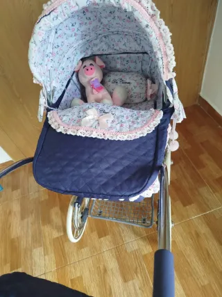 Precioso cochecito de muñecas de estilo clásico, perfecto para jugar. - Estructura metálica cromada. - Capazo azul con detalles de encaje rosa. - Ruedas grandes con radios. - Incluye bolso a juego. - mide el manillar 85cm,las ruedas están usadas,y tiene un pequeño golpe en el manillar