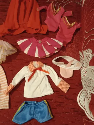 Conjunto de ropa para muñeca Nancy. En perfecto estado. - Chaqueta roja. - Dos bodies rosas con detalles dorados. - Falda rosa y blanca. - Vestido blanco con detalles a cuadros y lazo naranja. - Pantalón corto azul con detalles amarillos. - Zapatos rosas. - Tutú blanco con detalles dorados. Acepto el pago por wallapop, bizum, paypal y transferencia bancaria.