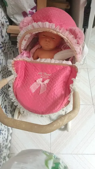 Cochecito de muñecas de estilo clásico, para muñecas reborn. Su altura lo hace muy cómodo de usar. - Color verde claro con detalles en rosa. - Incluye capota,sombrilla,bolso almohada, y cesta. - Diseño vintage. Lo vendo porque mi hija lo sacó dos veces es que está impecable Costó 160€ en Bustamante podéis comprobarlo
