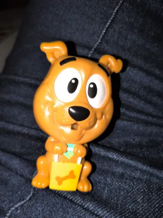 Figura coleccionable del personaje Scooby Doo. - Muñeco de plástico. - Color naranja. - Incluye una bolsa amarilla con un hueso.