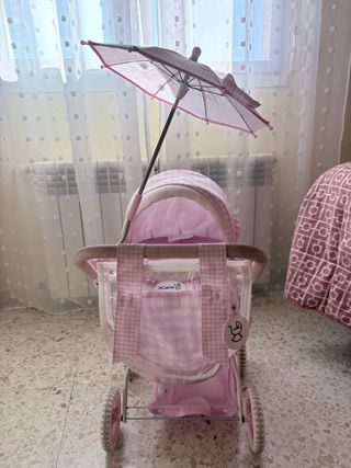 Carrito de muñecas en buen estado, con un bonito diseño a cuadros. - Color rosa. - Incluye sombrilla. - Asa de madera.