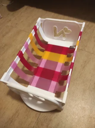 Cuna de plástico blanco para muñecas Nenuco. Tiene un diseño con tiras de colores en tonos rosa, rojo y amarillo. - Estructura de plástico blanco. - Tiras de colores: rosa, rojo y amarillo.