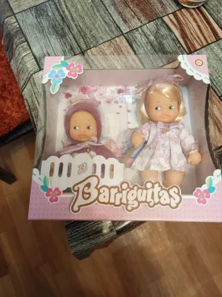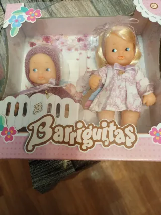 Set de dos muñecas Barriguitas. - Una muñeca lleva un vestido rosa con estampado floral y un lazo en la cabeza. - La otra muñeca lleva un gorrito y un conjunto de punto rosa.