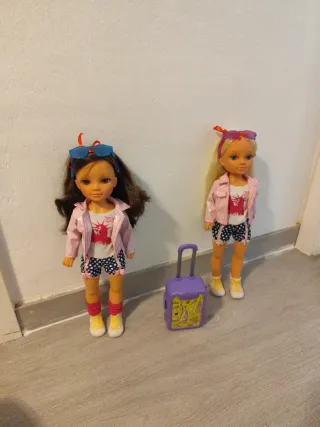 Lote de dos muñecas Namcys con temática de viajera a New York. Incluye un pequeño equipaje. - Muñecas con ropa y accesorios. - Equipaje morado con ruedas.