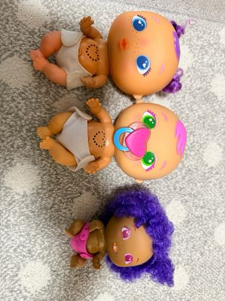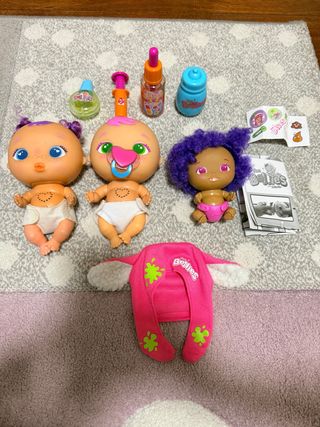 Lote de muñecas The Bellies con varios accesorios. - Tres muñecas The Bellies. - Accesorios de juego como biberones, jeringuillas y un gorro. - Pegatinas temáticas.