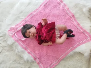 Manta artesanal tejida a crochet, perfecta para acompañar a tus muñecas. Su diseño a cuadros y el borde festoneado le dan un toque encantador. - Color rojo vibrante. - Adornada con un lazo de cinta de raso. - Ideal para muñecas.