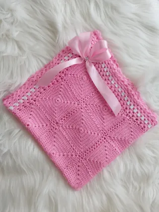 Manta tejida a mano con hilo de crochet, ideal para muñecas. - Diseño en color rosa con detalles blancos. - Adorno de lazo rosa con detalle plateado.