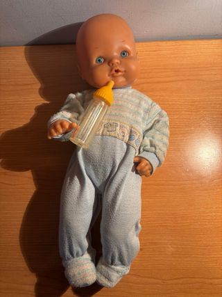 Muñeco bebé Nenuco con su biberón. - Ropa de bebé azul con estampado. - Biberón amarillo.