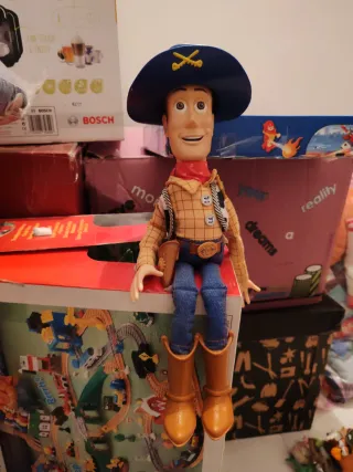 Muñeco del personaje Woody de la película Toy Story. - Incluye sombrero azul con insignia. - Viste camisa a cuadros, chaleco y pañuelo rojo. - Pantalones vaqueros y botas marrones.