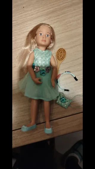 Muñeca Kruselings Vera con vestido y accesorios. - Vestido de tul verde con detalles. - Zapatos a juego. - Bolso pequeño. - Diadema. - Cepillo. Muñeca Kruselings original, con vestido, diadema, bolsito, cepillo y zapatos. Incluye tarjeta/catálogo original. En buen estado, ideal para jugar o coleccionar. 📍 Recogida en mano. 💰 Precio: 15 €