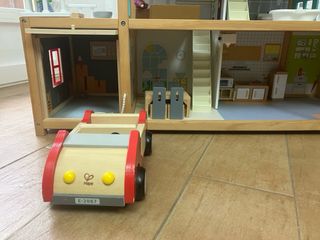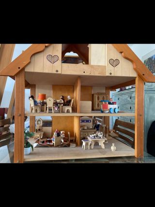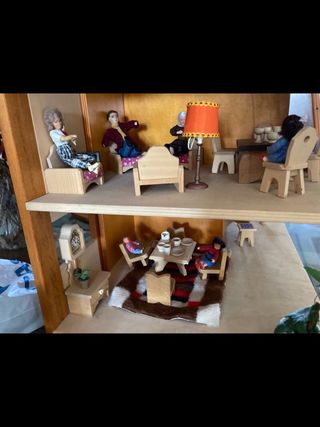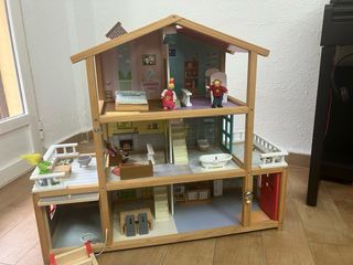 Casa de muñecas de juguete de madera con varios niveles y estancias. Incluye varios muñecos flexibles (y bebé) y un montón de accesorios (para dormitorio, sala de estar, cocina, baño y mascotas). Incluye 2 lámparas de pie funcionales, así como una puerta principal. Las medidas son: Largo 64 x Ancho (profundo) 31 x Alto 80 cm Completamente montada!!