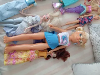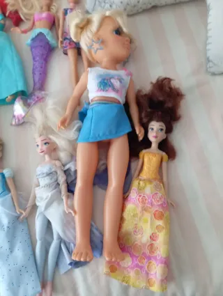 Se vende lote de muñecas variadas. se venden separadas. preguntar precio de casa muñeca - Muñeca sirena con cola morada. - Muñeca con vestido azul y top de unicornio. - Muñeca con vestido blanco y capa azul. - Muñeca con vestido amarillo y falda de flores.