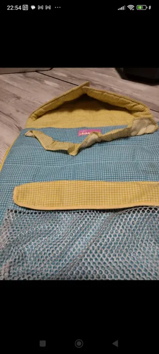 Saquito para muñecos con un diseño de cuadros. - Tejido exterior de cuadros azules y blancos. - Forro interior y detalles en amarillo. - Acolchado para mayor comodidad. Saquito para muñecos, con bolsita para llevar sus complementos (peine y botes de jabón), se puede usar como saco y se pone con capucha, mide 28 de ancho por 50 cm de largo