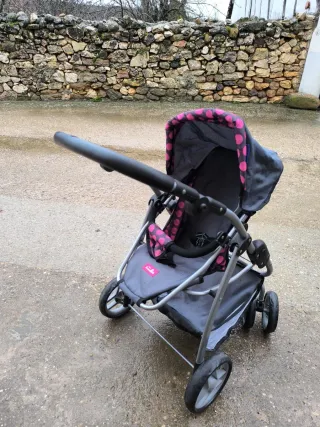 Sillita de muñeca con un diseño divertido y práctico. Marca Mimittos. Son dos piezas (Silla y carro) para jugar en el mismo soporte. - Estructura metálica. - Capota con lunares rosas. - Asiento acolchado. Pregunta sin compromiso.