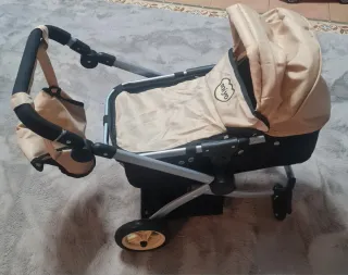 Carrito de muñecas de la marca Miyo, ideal para jugar. - Diseño en color beige y negro. - Incluye capazo y bolso. - Estructura metálica. -Se deja con juego de sabana colchón y almohada y manta de lana hecho a mano. NUNCA HA PISADO LA CALLE, ESTA COMO NUEVO