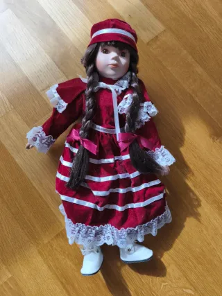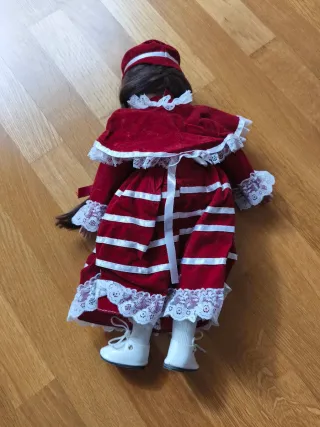 Preciosa muñeca de porcelana con un elegante vestido. - Vestido de terciopelo rojo con detalles blancos. - Trenzas largas y castañas. - Incluye sombrero a juego. - Zapatos blancos. Mide unos 40 cms.
