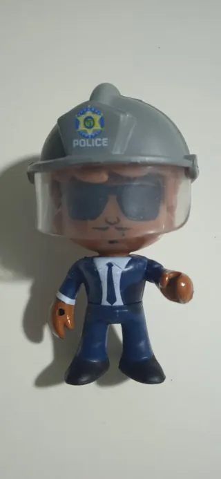 Figura de Pinypon con uniforme de policía. - Casco gris con visera transparente. - Uniforme azul con detalles blancos. - Insignia de policía en el casco.