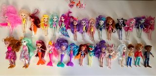 Conjunto de 10 muñecas de diferentes estilos y apariencias. - Incluye muñecas con vestidos variados. - Algunas muñecas tienen colas de sirena. - Variedad de colores de pelo y atuendos.