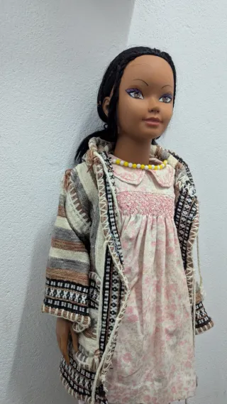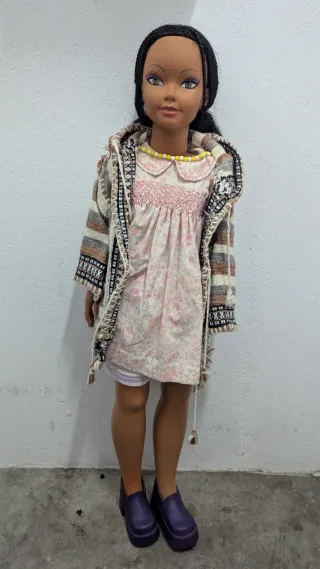 Muñeca Rosaura con un bonito vestido y chaqueta. - Vestido rosa con estampado floral. - Chaqueta de punto con diseño étnico. - Collar de cuentas amarillas y blancas. Mide 105 cm de altura