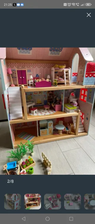 Casa de muñecas de madera con varios niveles y accesorios. - Diseño de tres pisos. - Incluye escaleras y alfombras decorativas. - Techo con diseño de corazones. - Marca: KidKraft.