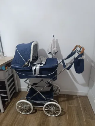 Carrito de estilo clásico para muñecos reborn o de juego. Su diseño es elegante y detallado, perfecto para los más pequeños. - Color azul marino con detalles blancos. - Incluye capota y sombrilla a juego. - Cesta inferior para accesorios. - Ruedas grandes y manillar ajustable.