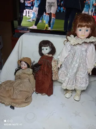 Conjunto de tres muñecas de porcelana con vestidos de época. - Muñeca con vestido beige y sombrero. - Muñeca con vestido marrón y blusa floral. - Muñeca con vestido rosa floral y cuello de encaje. - Observar bien las fotografías sirven para mejorar la descripción gracias - El envío sería solo por la misma aplicación de wallapop para mayor rapidez y seguridad del comprador y del vendedor ó entrega en mano