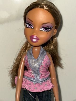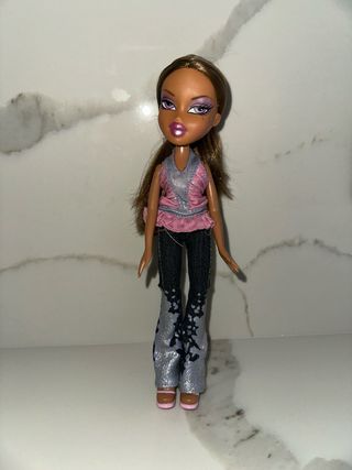 Muñeca Bratz Yasmin de la colección Passion 4 Fashion. - Incluye top rosa y plateado. - Pantalones vaqueros grises con detalles plateados. - Zapatos marrones. - Presenta desgaste en el labio.