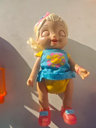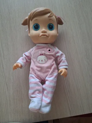 Muñeca de juguete con apariencia de bebé. - Ojos azules grandes. - Cuerpo de plástico. - Sin pelo.