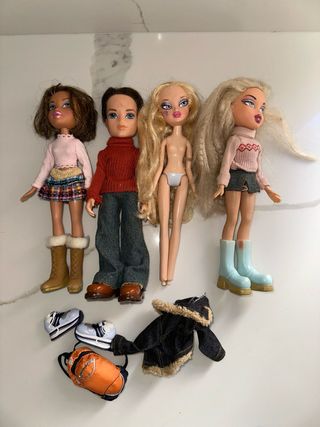 Lote de muñecas Bratz con varios accesorios. - Incluye 4 muñecas. - Ropa y calzado variado. - Mochila naranja. - Chaqueta vaquera con borreguito. - Defectos visibles en fotos.