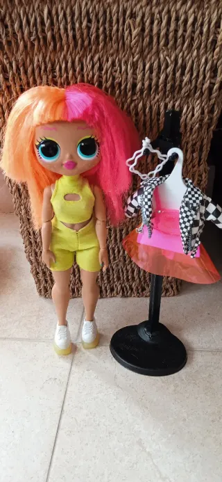 Muñeca LOL Surprise con su conjunto de ropa y accesorios. - Conjunto de top y shorts amarillos. - Zapatos blancos. - Chaqueta a cuadros y falda rosa. - Percha para ropa.
