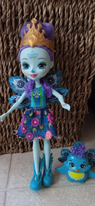 Muñeca de la colección Enchantimals con temática de hada pavo real. Incluye un pequeño compañero. - Diseño detallado con alas de pavo real. - Vestido colorido con estampado floral. - Corona dorada. - Zapatos azules. - Compañero azul con detalles de pavo real.