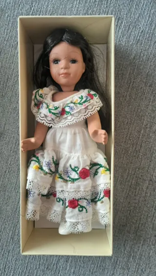 Muñeca de porcelana con vestido tradicional bordado. - Vestido blanco con bordados florales multicolores. - Cuello y mangas con encaje. - Cabello largo y oscuro.