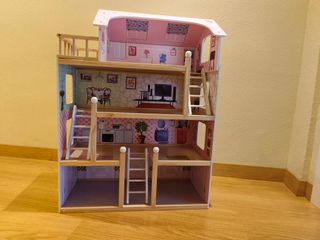 Fantástica casita de muñecas de madera, ideal para horas de juego. - Diseño de varias plantas. - Múltiples habitaciones detalladas. - Escaleras de acceso entre pisos. - Techo a dos aguas.