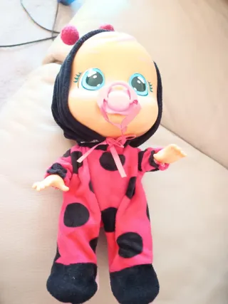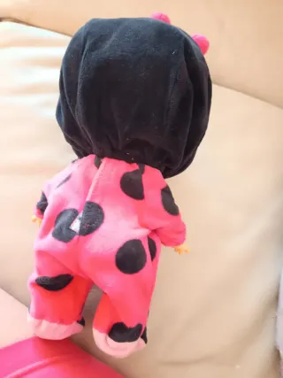 Muñeco bebé llorón con un adorable traje de mariquita. - Traje rosa con lunares negros. - Capucha negra con antenas. - Chupete rosa.