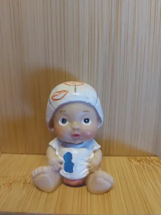Figura coleccionable de un bebé. - Diseño divertido con gorro decorado. - Ropa con un detalle azul. - Sentado con los pies extendidos.