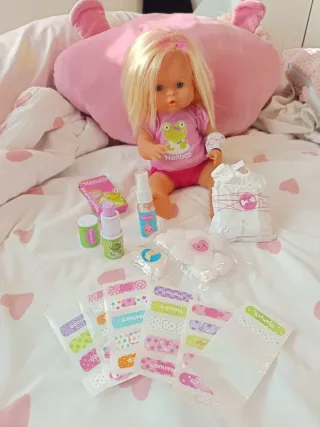 Nenuco Cura Sana y accesorios todos y originales a falta solo del lacito. PASTA DE ESCAYOLA DE VERDAD!! Ver en (Última foto). - Muñeca Nenuco de 30 cm con camiseta rosa y detalles de rana. - Spray, bálsamo labial y otros accesorios. No incluye caja.
