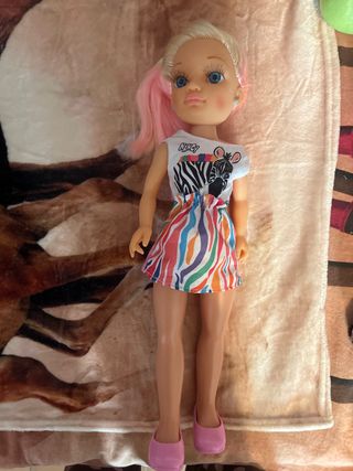 Muñeca Nancy en perfecto estado, como nueva. - Vestido blanco con estampado de cebra y rayas de colores. - Zapatos rosas. - Pelo rubio con mechones rosas.