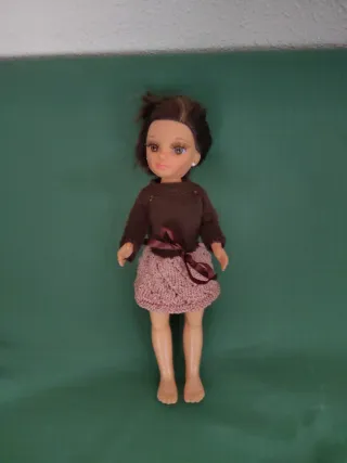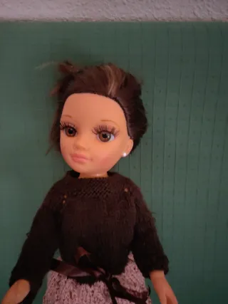 Muñeca Nancy con un conjunto de ropa. - Vestido de punto marrón. - Falda tejida rosa con lazo de cinta. - Pelo castaño con mechas rubias.