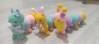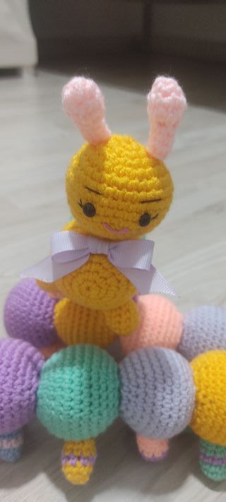 Oruga de crochet, hecha a mano en diferentes colores. Ojos de seguridad y todas las uniones están tejidas. Ideal tanto para niños pequeños como para mayores. Relleno blandito e hipoalergénico. Se pueden realizar por encargo y personalizar colores.