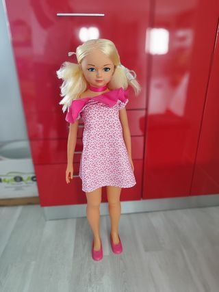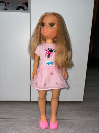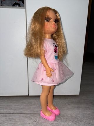 Muñeca Nancy con un bonito vestido rosa. - Vestido con estampado de mariquitas. - Zapatos rosas a juego.