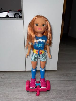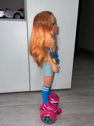 Muñeca Nancy con patinete tipo hoverboard. - Muñeca con pelo naranja. - Camiseta azul con diseño blanco. - Pantalones cortos de rayas verdes y blancas. - Calcetines azules con rayas blancas. - Zapatillas rosas.
