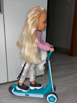 Muñeca Nancy con patinete. - Patinete de color turquesa y blanco. - Muñeca con pelo rubio largo. - Incluye ropa deportiva rosa.
