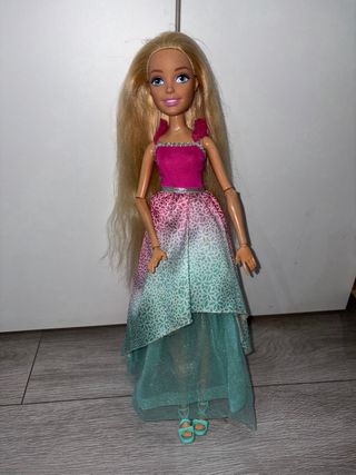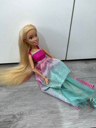 Muñeca Barbie con un bonito vestido degradado de color rosa a turquesa. - Vestido con estampado floral. - Tirantes plateados. - Zapatos a juego.