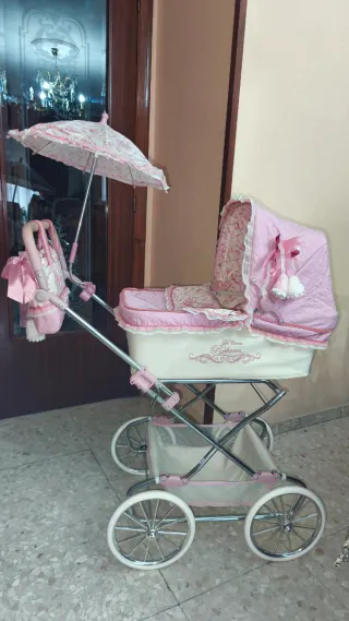Carrito de bebé estilo clásico, perfecto para muñecas Reborn. - Diseño elegante en color blanco y rosa. - Incluye bolso, capota y sombrilla a juego. - Cesta inferior para accesorios. - Ruedas grandes con detalles en blanco.