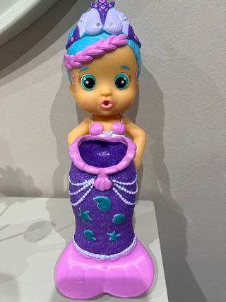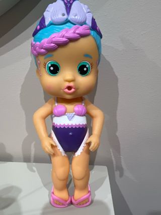 Muñeca Bloopies Mermaid Magic con temática de sirena. - Pelo azul con trenza rosa. - Traje de baño morado con detalles blancos y conchas. - Chanclas rosas. -Hace burbujas en el agua -Se pone y se quita la cola.