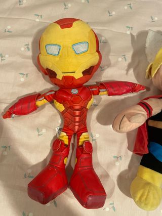 Set de dos muñecos de peluche de superhéroes. - Personaje Iron Man con traje rojo y amarillo. - Personaje Thor con casco y martillo.