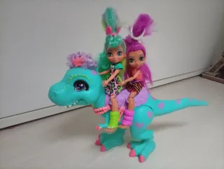 Set de muñecas Cave Club con su dinosaurio. En muy buen estado. - Incluye dos muñecas. - Dinosaurio de color azul con detalles rosas. - Accesorios para las muñecas.